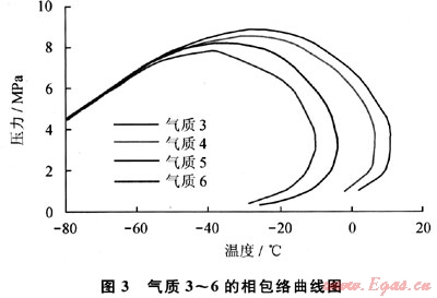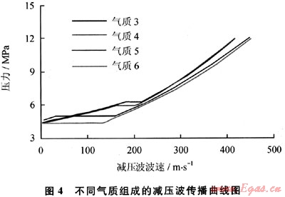 圖3為氣質(zhì)3~6的相包絡(luò)曲線圖,由表2和圖3可知,從氣質(zhì)3到氣質(zhì)6,氣質(zhì)組成逐漸變“輕”,其相包絡(luò)曲線的氣液兩相區(qū)域逐漸變小。圖4為不同氣質(zhì)組成的減壓波傳播曲線,初始?jí)毫?2MPa,溫度為30℃。由圖4可知,各曲線出現(xiàn)“平臺(tái)”的壓力逐漸降低,“平臺(tái)”位置下降。由此可以推測(cè),若氣質(zhì)組成中重組分含量減少至某程度時(shí),減壓波曲線中的平臺(tái)將消失,變?yōu)橐粭l光滑的曲線。也就是說(shuō),隨著重組分含量的增加,減壓波曲線容易進(jìn)入兩相區(qū),壓力保持在高位不能迅速下降,增大了管道裂紋擴(kuò)展的風(fēng)險(xiǎn)。