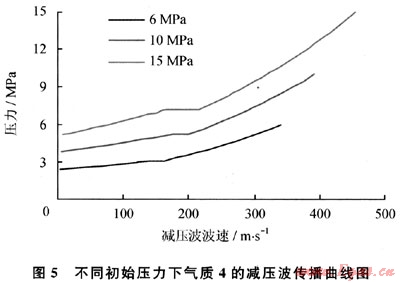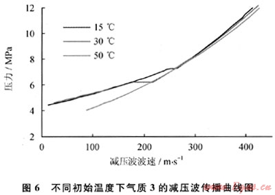 為了研究初始?jí)毫?duì)減壓波特性的影響,以表2中氣質(zhì)4為例,保持初始溫度30℃不變,采用Decomwave軟件對(duì)不同初始?jí)毫?6MPa、10MPa、15MPa)的減壓波波速進(jìn)行計(jì)算,結(jié)果如圖5所示。
