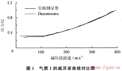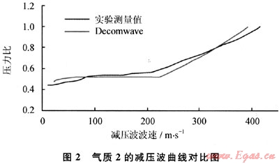 圖1為氣質(zhì)1減壓波波速計(jì)算結(jié)果與文獻(xiàn)實(shí)驗(yàn)數(shù)據(jù)的對(duì)比圖,初始?jí)毫?0.58MPa,溫度為-25.59℃。圖中“實(shí)驗(yàn)測(cè)量值”指本文參考文獻(xiàn)[6]中通過(guò)實(shí)驗(yàn)測(cè)得的數(shù)據(jù),“Decomwave”為開(kāi)發(fā)軟件計(jì)算的減壓波波速結(jié)果。