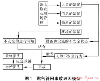 筆者認(rèn)為:燃?xì)馐鹿实陌l(fā)生是一些事件鏈的組合,由燃?xì)夤芫W(wǎng)施工、運(yùn)行過程中存在的管理失誤,產(chǎn)生人員、物質(zhì)、環(huán)境和信息的缺陷,而這些缺陷又引起了職工的不安全行為、設(shè)備和設(shè)施的不安全狀態(tài)以及不安全的生產(chǎn)環(huán)境,最終導(dǎo)致了燃?xì)馐鹿实陌l(fā)生。