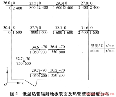 測試得到低溫?zé)峁茌椛涞匕灞砻嫫骄鶞囟葹?8.9℃,最高溫度為32.3℃,溫度不均勻度為8.4%,如果提高熱管的排列密度,不均勻度可以大大下降。此外,地板表面的較高溫度分布在房間中部,較低溫度分布在熱管冷凝段對應(yīng)的房間邊緣,不同于普通塑料埋管地板,這種溫度梯度有利于減小地板由邊緣向外部的熱損失。