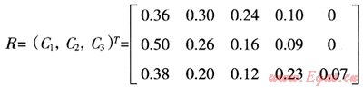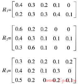 首先對U集中Ui作單因素評判,從因素Ui來確定評語集Vj(j=1,2,3…,m)的隸屬度rij,這樣就得到一個Ui的單因素評判集Ri={ri1,ri2,ri3,…,rim},R就反應(yīng)了U、V之間存在的某種模糊約束關(guān)系: