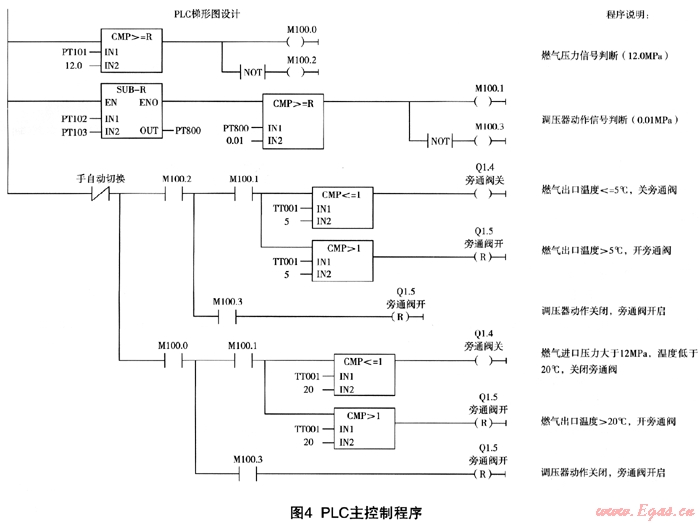 自動系統(tǒng)需要4個開關(guān)量信號:燃?xì)膺M(jìn)口壓力開關(guān)信號(動作值12MPa);二級調(diào)壓器前后差壓開關(guān)信號(動作值0);燃?xì)獬隹跍囟刃盘?動作值20℃);燃?xì)獬隹跍囟刃盘?動作值5℃)。輸入開關(guān)量信號采用原系統(tǒng)自有的模擬量輸入信號(一級調(diào)壓器前壓力和燃?xì)獬隹跍囟?,通過PLC控制程序(比較模塊)實現(xiàn)3個開關(guān)量信號。輸出信號有2個:旁通閥開啟信號,旁通閥關(guān)閉信號。