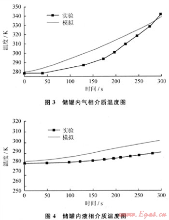 圖3、4分別為氣相介質(zhì)和液相介質(zhì)的溫度響應過程,計算值與實驗值吻合較好,最大誤差分別為4.5%和4%。其中,氣相取距離儲罐頂部50mm處的介質(zhì)溫度,液相取距離儲罐底部200mm處介質(zhì)的溫度。由圖3和圖4對比可知,液相介質(zhì)的溫度升高較氣相介質(zhì)緩慢,300s內(nèi)氣相介質(zhì)和液相介質(zhì)的溫度分別升高了63K和11K。原因在于一方面蒸汽的比熱容遠小于液相的[2];另一方面液相介質(zhì)過熱后會通過相變將熱量轉(zhuǎn)化到氣相,使得液相介質(zhì)本身儲存的熱量較少。