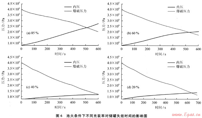 3) 池火作用下,LPG儲罐失效受到兩個因素控制,一是介質(zhì)溫度升高導致的儲罐內(nèi)介質(zhì)壓力升高,二是氣相區(qū)壁溫升高導致的強度下降。兩條曲線的交叉點即為儲罐的失效點。儲罐內(nèi)介質(zhì)的充裝率越高,儲罐失效時間越短。