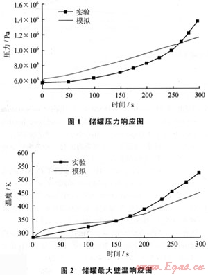 圖1、2所示分別為儲罐內(nèi)部壓力響應過程和儲罐壁溫響應過程。由圖1可見,池火災作用下,儲罐壓力上升速度比較慢,原因在于均勻的池火與儲罐外壁間的對流換熱系數(shù)很小,主要依靠熱輻射作用傳熱;在300s左右,儲罐內(nèi)部壓力上升至安全閥的開啟值1.41MPa。圖2顯示儲罐最大壁溫的上升速度逐漸加快??傮w而言,圖1、2顯示的模擬值與實驗值基本吻合,壓力響應和壁溫響應的最大誤差分別為19%和14.3%,偏差產(chǎn)生的主要原因可能在于簡化的火焰輻射模型難以與真實火焰對儲罐外壁的加熱條件達到完全一致。