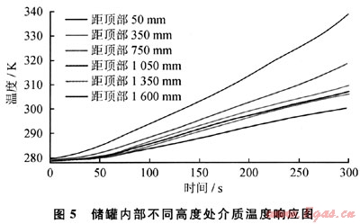 圖5所示為儲罐內(nèi)不同高度處介質(zhì)的溫度響應規(guī)律??梢钥闯?,池火作用下儲罐內(nèi)部存在熱分層現(xiàn)象,溫度總體呈現(xiàn)上高下低的趨勢。本文所模擬的LPG儲罐的初始充裝率為72%,對應的氣液分界面位于距儲罐頂部540mm處。可見,氣相溫度明顯高于液相,且距離液面越遠氣相溫度越高,說明氣相除了通過相變吸熱外,還通過氣相壁面吸收輻射熱量;另外,在距離儲罐頂部1350mm以下的液相區(qū),介質(zhì)溫度降低明顯,說明過冷液體區(qū)與液相分層區(qū)[2]的分界面可能位于此處附近。