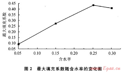 其得到的結(jié)果顯示在含水率小于30%時(shí),可以用最大填充系數(shù)值Φmax為0.57來(lái)計(jì)算,并且計(jì)算的結(jié)果與實(shí)驗(yàn)的測(cè)量值很吻合。本實(shí)驗(yàn)所使用的柴油黏度為5.12mPa·s,試圖運(yùn)用Pauchard的方法來(lái)尋求一個(gè)適當(dāng)?shù)?Phi;max值進(jìn)行漿液黏度的預(yù)測(cè),因此,反算出了在不同含水率下的Φmax值,如圖2所示。計(jì)算結(jié)果顯示含水率分別為25%和30%時(shí)的最大填充系數(shù)分別為0.436和0.414;而當(dāng)含水率分別為5%和15%時(shí)的最大填充系數(shù)分別為0.093和0.275。本結(jié)果與文獻(xiàn)中的差異可能是由于所選用的實(shí)驗(yàn)介質(zhì)和環(huán)境不同等綜合因素引起的。從圖2中還可以發(fā)現(xiàn):在含水率小于25%時(shí)最大填充系數(shù)隨著含水率的增加而增加,幾乎呈線(xiàn)性關(guān)系,以此擬合出填充系數(shù)與含水率的關(guān)系: