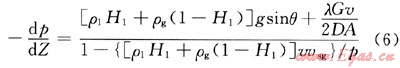 式中ρ1為液相密度,kg/m3;ρg為氣相密度,kg/m3;H1為持液率;g為重力加速度,m/s2;0為管線傾角,(°);λ為阻力系數(shù);G為混合物的質(zhì)量流量,kg/s;v為混合物平均流速,m/s;vsg為氣相表觀流速,m/s;p為管線平均壓力,Pa,D為管徑,m;A為橫截面積,m2