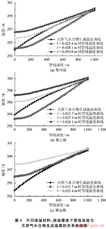 聚丙烯、聚乙烯和聚氨酯作為3種基本的保溫材料被廣泛應(yīng)用在石油天然氣工業(yè)的管道設(shè)計(jì)中[4],其熱傳導(dǎo)系數(shù)分別為0.35W/m·K、0.22W/m·K和0.12W/m·K(考慮一定的吸水率),不同保溫材料、保溫厚度下的管線溫度與天然氣水合物生成的溫度關(guān)系圖見(jiàn)圖4。