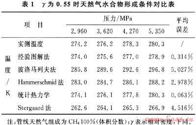 通過(guò)對(duì)比可以看出,5種方法中統(tǒng)計(jì)熱力學(xué)方法的預(yù)測(cè)結(jié)果最為準(zhǔn)確,但是需要天然氣組分的詳細(xì)資料,而且計(jì)算繁瑣,導(dǎo)致其應(yīng)用受到一定的限制;經(jīng)驗(yàn)圖解法也可得到較好的預(yù)測(cè)結(jié)果,平均誤差小于1%,且計(jì)算簡(jiǎn)單,使用方便。