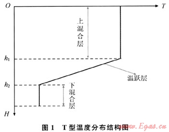 值得注意的是深水中垂向溫度分布較陸地復(fù)雜得多[5]:深水中,隨著深度的增加環(huán)境溫度是逐漸降低的,和陸地不同,深水垂向溫度呈現(xiàn)不規(guī)則的變化,一般可以擬合為多種垂向溫度分布結(jié)構(gòu);陸上垂向溫度分布隨季節(jié)變化很小,而深水環(huán)境中則不同,甚至分布結(jié)構(gòu)也會(huì)發(fā)生變化,因此,采用最常見(jiàn)的T型分布結(jié)構(gòu)進(jìn)行計(jì)算。所謂T型結(jié)構(gòu)即呈現(xiàn)為上面為混合層,中間為溫躍層,下面為混合層的3層結(jié)構(gòu),躍層上、下界點(diǎn)明顯,如圖1所示。