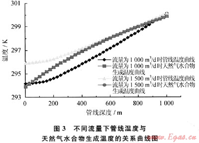由圖3可以看出,隨著壓力的增加,天然氣水合物的生成溫度逐漸增高。流量增大后,管線溫度曲線明顯上移,且受外界環(huán)境溫度的影響減弱,這是因?yàn)榱魉偌涌旌罅黧w與外界環(huán)境之間的熱交換時(shí)間減少所致;而此時(shí)天然氣水合物生成溫度曲線卻有輕微的下移,這是因?yàn)榱髁吭龃蠛?,摩擦損失增大,導(dǎo)致管線內(nèi)對(duì)應(yīng)點(diǎn)的壓力減少。也就是說(shuō),流量增大導(dǎo)致2條曲線向相反的方向發(fā)展,因而,可以通過(guò)調(diào)整流量來(lái)實(shí)現(xiàn)管線的正常傳輸。在上例中,流量不能低于1500m3/d,這樣才能保證該管線的正常傳輸。