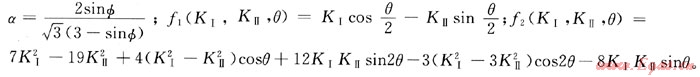 國內(nèi)外學者對裂紋的失穩(wěn)擴展研究取得了豐碩的成果,建立了相應的斷裂準則[6~7]通過適用性分析,筆者選用了基于巖石破壞準則的巖石斷裂判據(jù)[6]。筆者利用D-P破壞準則,并結合裂紋尖端的應力場、應力強度因子和斷裂韌度提出了該判據(jù),具體推導過程見本文參考文獻[6]。