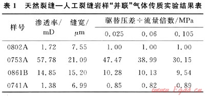 “并聯(lián)”傳質(zhì)實(shí)驗(yàn)中,裂縫寬度是影響致密砂巖天然氣傳質(zhì)的關(guān)鍵參數(shù),裂縫寬度越大其傳質(zhì)效率越高。在天然裂縫-人工裂縫并聯(lián)傳質(zhì)實(shí)驗(yàn)中,裂縫寬度相近的兩類(lèi)裂縫,人工裂縫傳質(zhì)效率低于天然裂縫。分析認(rèn)為,由于人工裂縫縫面屬于新鮮斷面,有較多的可動(dòng)微粒,隨著驅(qū)替壓差的增加,氣體流速增大,參與運(yùn)移的微粒增多,部分微粒在縫面狹窄處沉積、堵塞,使得裂縫滲流能力大幅降低;另外實(shí)驗(yàn)過(guò)程是采取的連續(xù)變驅(qū)替壓力,圍壓不變的方式,在長(zhǎng)時(shí)間的圍壓(3MPa)條件下,由于有效應(yīng)力的時(shí)間效應(yīng)[8],無(wú)支撐的人工裂縫寬度相應(yīng)降低,而天然裂縫經(jīng)過(guò)漫長(zhǎng)的地質(zhì)演化,天然縫縫面間有膠結(jié)物、顆粒支撐,抗應(yīng)力敏感能力強(qiáng)于天然縫,裂縫寬度變化相應(yīng)較小,其滲流能力降低幅度小。