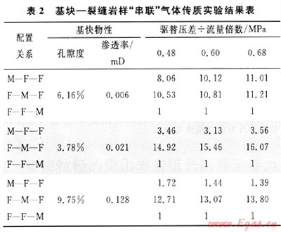 基塊物性不變,變換裂縫-基塊配置關(guān)系,對(duì)比各個(gè)配置關(guān)系傳質(zhì)效率,表2實(shí)驗(yàn)結(jié)果表明:F-F-M配置關(guān)系傳質(zhì)效率最低,以F-M-F配置關(guān)系傳質(zhì)效率最優(yōu)。實(shí)驗(yàn)數(shù)據(jù)統(tǒng)計(jì)表明:F-M-F配置傳質(zhì)效率是F-F-M配置的10~16倍,M-F-F配置傳質(zhì)效率是F-F-M配置的1~13倍。