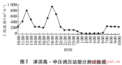 例如,津?yàn)I高-中壓調(diào)壓站有4臺(tái)型號(hào)為L(zhǎng)WQ-A-2500的渦輪流量計(jì),工況流量量程為125~2500m3/h,精度等級(jí)為1級(jí),運(yùn)行2臺(tái)。工況流量是指在管道介質(zhì)運(yùn)行壓力及溫度條件下的流量。從2009年8月4日10:00至8月5日10:00津?yàn)I高-中壓調(diào)壓站測(cè)試統(tǒng)計(jì)數(shù)據(jù)看,其計(jì)量表內(nèi)天然氣溫度為22.4~22.9℃,壓力為0.56~0.80MPa。18:00為用氣高峰,瞬時(shí)流量為948m3/h;而凌晨1:00—6:00為用氣低谷,瞬時(shí)流量為30m3/h左右。部分測(cè)試數(shù)據(jù)見(jiàn)圖2。