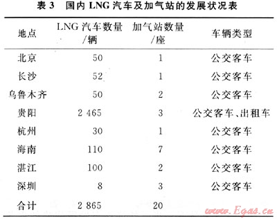 目前國內只有北京、烏魯木齊、長沙、貴陽、海南等城市和地區(qū)進行了LNG汽車技術示范應用,并主要局限在公交車領域的應用。據調查,截止到2009年12月全國僅有2800余輛LNG汽車運行,已建成的部分LNG加氣站情況如表3所示。