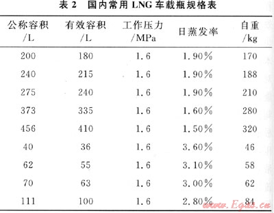 作為汽車燃料,LNG較CNG具有以下優(yōu)勢:①燃料雜質少、純度高(個別LNG中甲烷含量能達到99%)、精純的LNG燃燒更徹底,使發(fā)動機性能充分發(fā)揮,排放更加潔凈;②CNG汽車相對于汽油和柴油汽車而言,動力性下降5%~15%,而電噴式LNG汽車相對于汽油和柴油汽車,動力降低不到2%[2];③LNG儲罐為常壓低溫絕熱容器,比CNG高壓鋼瓶壓力要求低,自重降低很多;④LNG常壓使用,防撞、抗爆性好,LNG汽車較CNG汽車更安全;⑤由于燃料儲箱體積小,重量輕,燃料能量密度大,相應提高了汽車裝載利用率[3],LNG汽車續(xù)駛里程約為CNG汽車的3倍,可超過400km。
