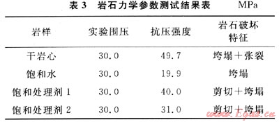 評價井壁穩(wěn)定處理劑綜合性能的重要方法之一就是測量對比飽和處理劑與飽和水的巖石力學(xué)參數(shù)變化。室內(nèi)采用聚合物處理劑浸泡過的泥巖巖樣進行巖石力學(xué)參數(shù)測試。實驗結(jié)果見表3。
