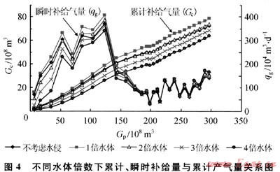從圖4不同水體倍數(shù)下累計(jì)補(bǔ)給氣量來看,A區(qū)塊存在補(bǔ)給情況,當(dāng)不考慮水侵時(shí)計(jì)算的累計(jì)補(bǔ)給量為72.13×108m3??紤]水侵時(shí),分別計(jì)算了1~4倍水體大小的補(bǔ)給情況,結(jié)果顯示氣藏水體應(yīng)在2倍以上,此結(jié)論與地質(zhì)上判斷氣藏水體倍數(shù)為2.1~3.1倍相符。同時(shí)還可以看到水體倍數(shù)越大水侵量越大,其他區(qū)塊氣體的補(bǔ)給量也就越??;水體大小對(duì)初期瞬時(shí)補(bǔ)給量影響較大,后期氣田生產(chǎn)穩(wěn)定后不同水體倍數(shù)下的瞬時(shí)補(bǔ)給量一致。