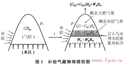 1936年,Schilthus首先推導(dǎo)出體積物質(zhì)平衡方程,此方法可以簡(jiǎn)單有效的估算地層內(nèi)原始?xì)怏w和氣藏枯竭各階段天然氣儲(chǔ)量,是油氣藏動(dòng)態(tài)分析的一種標(biāo)準(zhǔn)的油氣藏丁程工具。筆者借鑒物質(zhì)平衡原理[2,13~15],將氣藏模擬為單獨(dú)儲(chǔ)罐體,并考慮有外來天然氣及水體通過薄的可滲透邊界不斷流入氣藏的情況下建立新的補(bǔ)給氣藏物理模型(圖1)。
