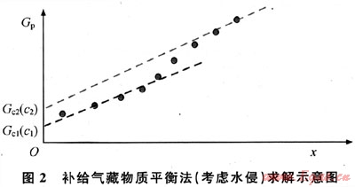 當(dāng)氣藏有外來氣體補(bǔ)給并有邊水或底水侵入時(shí),由于氣相的相對(duì)滲透率大于水相相對(duì)滲透率,氣藏的補(bǔ)給會(huì)發(fā)生在水侵之前,然而一旦氣藏補(bǔ)給和水侵同時(shí)發(fā)生僅從物質(zhì)平衡方程無法將二者分開計(jì)算,需要借用水侵計(jì)算方法,例如Cater-Tracy方法、Fetkovich方法或者快速褶積積分法。先計(jì)算水侵量大小,再代入補(bǔ)給氣藏物質(zhì)平衡方程計(jì)算補(bǔ)給氣量的大小。