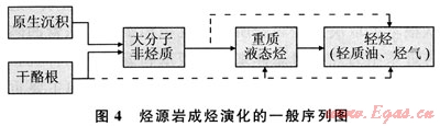 總之,有機質(zhì)成烴是系列的演化過程(圖4),大分子非烴類是成油的最直接母源,其成因除傳統(tǒng)地認為由干酪根降解形成外,在保存較好的條件下(如咸水環(huán)境)可在沉積過程中直接形成,這種情況一般也與低熟油的形成有關(guān),即原生沉積的非烴類有機大分子早期降解可形成低熟油。而干酪根由于所處烴源巖條件的差異可發(fā)生不同期的降解,按序列形成各類產(chǎn)物。重質(zhì)液態(tài)烴開始形成時烴源巖真正進入生烴階段,依次進行其后各級別的降解。該序列是演化的主體過程,但在每一級降解的過程中,都會伴隨生成其他級別的產(chǎn)物,不同的生烴階段所處的降解級別也有差異。