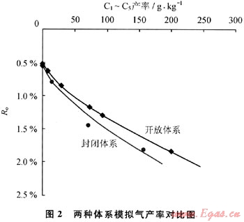 烴源巖在降解生油的同時生成烴類氣體(圖2)。隨熱演化程度增高,開放體系和封閉體系的烴氣產(chǎn)率大致按相近的趨勢增長,在達生油高峰之前(Ro<1.O%)二者差別不大,但其后差別逐漸明顯。在相同的成熟階段封閉體系比開放體系氣產(chǎn)率略低,說明壓力的存在對氣體的生成有一定抑制作用。前人大多認為封閉體系與開放體系相比,由于二次裂解生成的氣體較多,這應(yīng)與實驗中實現(xiàn)的條件有關(guān)。本次封閉體系的實驗中,烴源巖樣品位于反應(yīng)區(qū),其生成的油氣從樣品排出后由于存在流體壓力的調(diào)整(恒定壓力)及上浮現(xiàn)象會繼續(xù)運移遠離反應(yīng)區(qū),在高壓釜溫度相對較低的上下端部儲集起來。因此這是一個與地下條件較為接近的生排烴動平衡過程。
