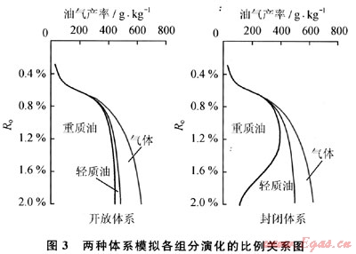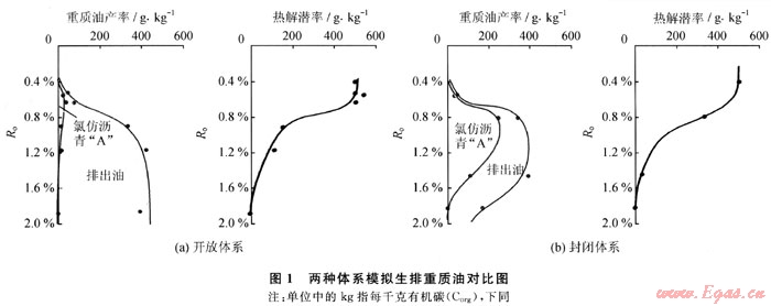 在兩種體系的模擬實驗中形成了不同數(shù)量的重質(zhì)油,并以不同效率的排出(圖1)。開放體系生成的重質(zhì)油,殘留的部分(即氯仿瀝青“A”含量)較少,只在Ro=0.6%附近呈略微增高的趨勢,其后隨演化一直處于下降階段。在Ro=0.5%之后即開始排油,主生油階段大部分重質(zhì)油即已排出,是由于其生成以后缺少壓力的抑制作用所致。重質(zhì)油總量在Ro=1.0%之前增加速度較快,Ro=1.0%時的高演化階段變化趨于平緩。這種情形與地下差別較大,即地下烴源巖的生排烴不可能處于完全開放的體系中。
