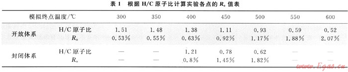 通過模擬實驗,可以獲取天然氣、水樣、含油石英砂(封閉體系)及源巖固體殘渣。天然氣直接進行組分測試。水樣用二氯甲烷萃取,高壓釜及管線用二氯甲烷清洗,含油石英砂用氯仿抽提,均得到排出重質(zhì)油。源巖固體殘渣用氯仿抽提,抽提后殘余再進行熱解、有機碳、干酪根處理、Ro及C、H、O元素測試。為使各種條件下的演化互相對應(yīng),采用H/C作為成熟度指標與Ro聯(lián)系起來。例如Baskin引用Van Krevelen圖解表明干酪根不同Ro演化區(qū)間H/C原子比的變化[9],利用該圖解通過內(nèi)差計算各溫度點的Ro(表1)。