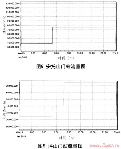 坪山門(mén)站在22:00最大流量為80643m3/h,接近大鵬坪山分輸站兩路調(diào)壓器的供氣能力,除2:30~7:30沒(méi)超過(guò)40000m3/h,其余時(shí)間均超過(guò)40000m3/h。