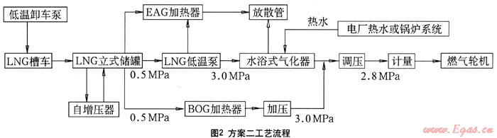 如果將明火水浴式氣化器改用水浴式氣化器,氣化器用熱水由電廠或者自建鍋爐系統(tǒng)提供,可以節(jié)省投資1089×104元。工藝流程詳見(jiàn)如下圖2。