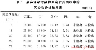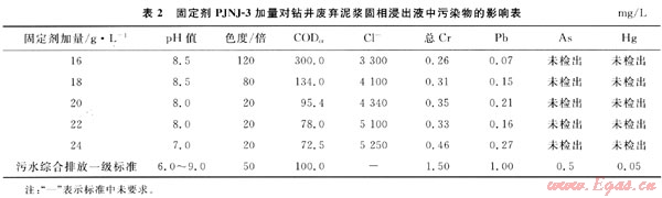 表2數(shù)據(jù)表明:隨著固定劑PJNJ-3的加入,廢棄泥漿分離出的固相物浸出液中主要污染物COD和色度在降低,總Cr和Pb的濃度略有增加,但不明顯,當(dāng)加量達(dá)到20g/L以上時(shí),浸出液中各項(xiàng)污染物指標(biāo)均能滿足污水綜合排放一級(jí)標(biāo)準(zhǔn)要求。
