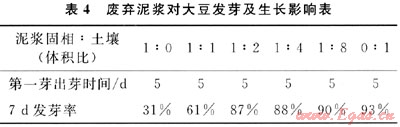 從表4可以看出:廢棄泥漿處理后的固相物對(duì)大豆發(fā)芽有著明顯的不利影響,可能主要是其中有較高濃度的Cl-所致;隨著摻入土壤量的增加,大豆發(fā)芽率明顯提高,當(dāng)土壤量增大到泥漿固相物的2倍以后,大豆發(fā)芽基本沒(méi)有影響。說(shuō)明只要摻入量合適,廢棄泥漿固相物是可以用作土壤的。