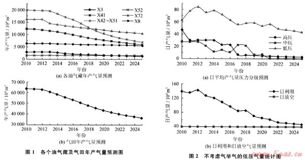 出于經濟考慮,日產氣量低于1×104m3的低壓氣不考慮回收,如果統(tǒng)一添加壓縮能力為20×104m3/d的壓縮機,那么添置情況為2010年1臺,2011年和2012年2臺,2013年1臺,2014年2臺,2015年和2016年1臺。添加壓縮機之后,日利用和日放空氣量預測情況如圖3-c,預計到2025年累計可回收低壓氣為47.26×108m3,比放空方案多回收4.79×104m3。