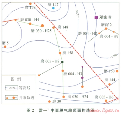 磨030-H24井位于磨溪?dú)馓镂鞫?,設(shè)計(jì)為一口開發(fā)磨溪?dú)馓锢滓?sup>1中亞段氣藏天然氣資源的水平井。為確保本井軌跡在雷一1中亞段儲(chǔ)層頂部順利著陸,保持鉆水平段前的入靶井眼軌跡姿態(tài),進(jìn)行了鉆井軌跡范圍內(nèi)的地層傾角、垂深、儲(chǔ)層厚度變化趨勢(shì)分析。