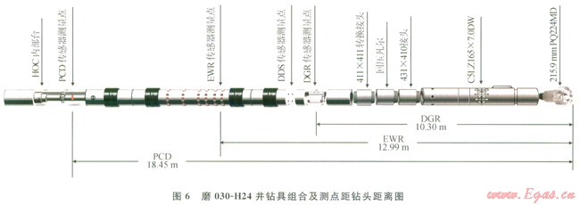 由于本井儲(chǔ)層厚度約6m,利用FEWD隨鉆上傳的伽馬、電阻率測(cè)井參數(shù)進(jìn)行井眼軌跡儲(chǔ)層著陸監(jiān)測(cè)時(shí),因地質(zhì)導(dǎo)向的DGR(雙向自然伽馬)、EWR-Phase4(感應(yīng)電阻率)、PCD(井斜、方位)傳感器測(cè)點(diǎn)到鉆頭距離分別為l0.6m、12.99m、18.45m(圖6),測(cè)量工具位置的限制使隨鉆測(cè)井信息具有較大的滯后性,給井眼軌跡在儲(chǔ)層頂部精確著陸帶來(lái)一定風(fēng)險(xiǎn),因而在機(jī)械鉆速較慢時(shí),可以利用巖屑錄井信息對(duì)隨鉆測(cè)井曲線前方盲區(qū)的比較重要地層界面信息進(jìn)行綜合預(yù)判,在進(jìn)入儲(chǔ)層前斜深l5m左右按隨鉆測(cè)井信息與錄井信息共同標(biāo)定距儲(chǔ)層頂距離,對(duì)入靶姿態(tài)進(jìn)行最終調(diào)整。