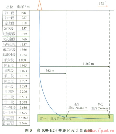 根據(jù)本井鄰井儲(chǔ)層深度、厚度、地層傾角變化分析,地質(zhì)提出了本井井眼軌跡基本要求:以井口為原點(diǎn),定向方位178°,靶前位移362m時(shí)進(jìn)入A點(diǎn),在雷一1中亞段第一儲(chǔ)層完成水平段長(zhǎng)1000m,設(shè)計(jì)全井井深(斜深)3890m(圖3、5)。