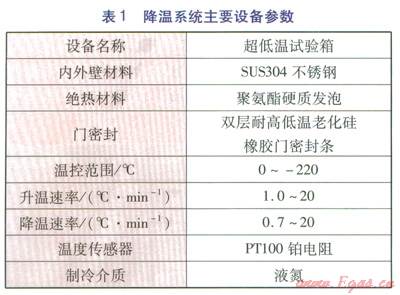 進行低溫試驗時,爆炸初始溫度低至-170℃,為滿足溫度要求,降溫系統(tǒng)采用超低溫試驗箱,液氮冷卻,溫度由智能儀表自動控制。降溫系統(tǒng)主要設備參數見表1