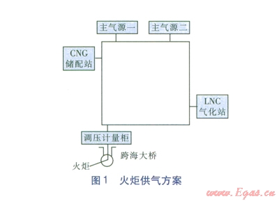 海陽市地處黃海之濱、山東半島的中南部、膠東半島南翼,南臨黃海,北接半島內(nèi)陸,位于煙臺(tái)、青島、威海三個(gè)開放窗口城市中心地帶,有“東方夏威夷”的美譽(yù),2012年第三屆亞洲沙灘運(yùn)動(dòng)會(huì)(以下簡稱亞沙會(huì))便在海陽市旅游度假區(qū)舉行。該地區(qū)天然氣的開發(fā)和經(jīng)營權(quán)屬我公司,給亞沙會(huì)火炬供氣即成為必然。根據(jù)公司管網(wǎng)現(xiàn)狀、氣源情況、火炬臺(tái)現(xiàn)場及亞沙會(huì)火炬設(shè)計(jì)方所提供的技術(shù)參數(shù)及其他綜合因素,提出火炬供氣方案,見圖l。