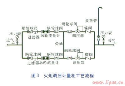 調(diào)壓計(jì)量柜內(nèi)安裝兩路調(diào)壓計(jì)量裝置,在兩路并聯(lián)的前提下增加旁通管將兩路裝置連接?;鹁嬲{(diào)壓計(jì)量柜工藝流程見圖3。燃?xì)庥?jì)量設(shè)施安裝于調(diào)壓器之前,一路采用工況(298.15K,0.26MPa)流量為l000m3h的渦輪流量計(jì);另一路計(jì)量采用工況(298.15K,0.26MPa)流量為650m3h渦輪流量計(jì):調(diào)壓器最大流量>4500m3h。