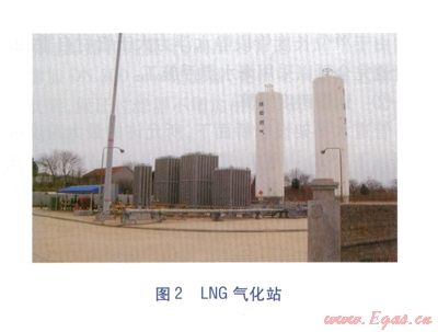 在長輸管道通氣之前,LNG氣化站一直是海陽旅游度假區(qū)的主要?dú)庠?。該氣化站是我公司?span lang="EN-US">2005年作為海陽市招商引資項(xiàng)目投資建設(shè)的(見圖2)。主要設(shè)備有兩臺(tái)l00m3立式LNG儲(chǔ)罐,一臺(tái)2000m3h空溫式氣化器,一臺(tái)2000m3h水浴式氣化器,一臺(tái)200m3h卸車增壓器,一臺(tái)400m3hBOG增壓器。日供氣量約10×104m3d。將LNG氣化站作為氣源三,其出口壓力為0.27MPa,出口管道規(guī)格為SDRll PE80 NOD 250mm,距離火炬調(diào)壓計(jì)量柜約7km,與主氣源一、二配合完全可以滿足火炬高峰用氣量。