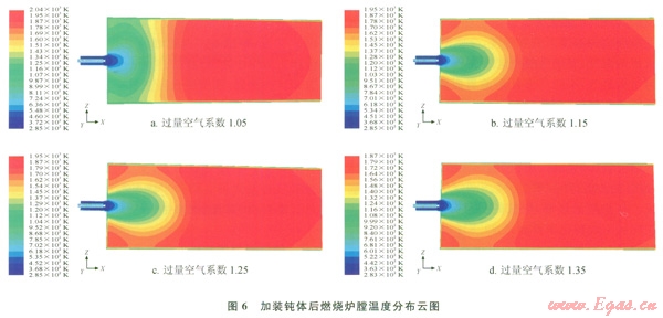 通過數(shù)值分析的方法研究了過量空氣系數(shù)(a,為1.05~1.35)對頁巖氣燃燒的爐膛內(nèi)溫度分布、轉(zhuǎn)化率及污染物排放的影響規(guī)律[16],并在燃燒器出口位置加裝鈍體對燃燒器進行優(yōu)化,提高燃燒效果。