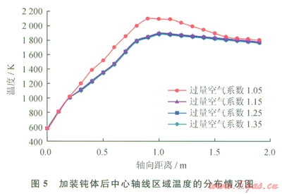 增加鈍體可以有效增加燃燒器出口的回流區(qū)域,使燃燒產(chǎn)生的高溫炯?xì)饣亓鳎黾尤紵姆€(wěn)定性,提高燃燒效率,同時還能有效提高爐膛溫度的均勻性。圖5為在燃燒器出口加裝鈍體后的中心軸線區(qū)域溫度分布情況,圖6為燃燒爐膛溫度分布云圖。
