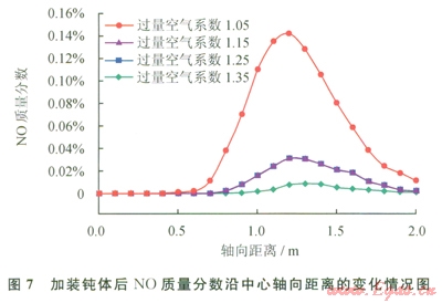 數(shù)值研究結(jié)果表明,加裝鈍體后甲烷的質(zhì)量分?jǐn)?shù)在出口處為0,加裝鈍體能夠?qū)崿F(xiàn)頁巖氣的完全燃燒。加裝鈍體優(yōu)化后,燃?xì)鈬姵龊笥龅解g體擾流,產(chǎn)生一定的回流區(qū)域,使高溫炯?xì)饣亓?,并加熱剛噴出的燃?xì)?,使其迅速燃燒,減少了著火時間。圖7為加裝鈍體后NO質(zhì)量分?jǐn)?shù)沿中心軸向距離的變化情況,與圖4中未加裝鈍體優(yōu)化前進行對比,加裝鈍體優(yōu)化后,在相同位置處NO的質(zhì)量分?jǐn)?shù)明顯降低,主要是由于加裝鈍體后,爐膛溫度有所降低,同時爐膛溫度較均勻。因此NO的生成量較少。