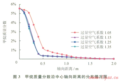 圖3反映了甲烷質(zhì)量分?jǐn)?shù)沿中心軸向距離的分布情況。在爐膛的尾部,甲烷的質(zhì)量分?jǐn)?shù)都幾乎為0,4種工況的甲烷轉(zhuǎn)化率都超過99.8%,其中,a為1.15、1.25、1.35這3種工況下的甲烷質(zhì)量分?jǐn)?shù)變化最快,到X為0.60m處就幾乎燃盡,容易在燃燒器根部形成高溫區(qū)域;a為1.05時,甲烷質(zhì)量分?jǐn)?shù)下降相對緩慢,在0.60m處達到1.2%。