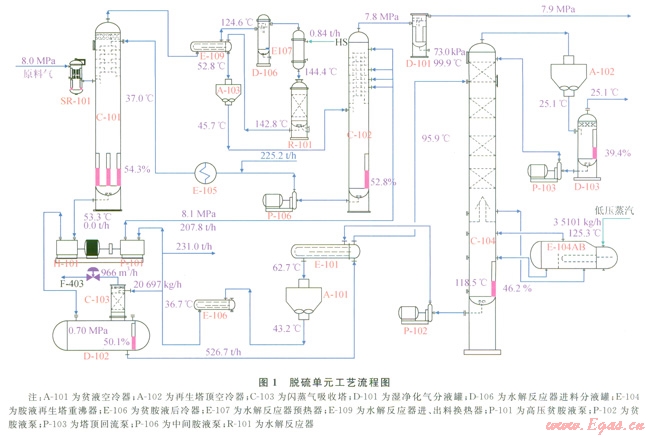 普光凈化廠引進美國Black&Veatch公司專利技術(shù),以MDEA溶液作為吸收劑,采用兩級吸收、級間冷卻工藝選擇性吸收H2S,其工藝流程如圖l所示。經(jīng)過濾器(SR-l01)分離出的高含硫天然氣進入一級吸收塔(C-101),與MDEA溶液在吸收塔內(nèi)逆流接觸,在二級吸收塔(C-102)底部用泵抽出半富胺液,經(jīng)過中間冷卻器(E-105),然后返回一級主吸收塔頂部,一級主吸收塔底部富胺液經(jīng)液力透平(H-101)回收能量后,進入富胺液閃蒸罐(D-102),閃蒸后的胺液經(jīng)貧富胺液換熱器(E-101)換熱后進入再生塔(C-l04)再生,再生后的貧胺液循環(huán)使用[2-4]。閃蒸出的氣體經(jīng)閃蒸塔吸收H2S后分兩路,少部分進入尾氣焚燒爐伴燒,大部分放空至低壓火炬燒掉。