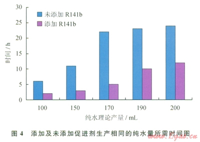 為了更清楚地了解Rl41b促進(jìn)劑對(duì)CO2水合物海水淡化效率的影響,筆者對(duì)比了兩組實(shí)驗(yàn)的相同理論純水產(chǎn)量所需的時(shí)間,結(jié)果見圖4。從圖4中可看出,生產(chǎn)相同量的純水,不添加Rl41b的實(shí)驗(yàn)所需時(shí)間為添加Rl4lIJ的2~4倍。
