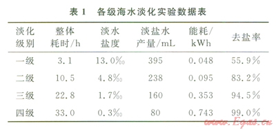 本研究選用的是青島周邊海域的海水,其鹽度為29.5‰±0.5‰。筆者共進(jìn)行了四級(jí)海水淡化實(shí)驗(yàn),表1為一到四級(jí)海水淡化的實(shí)驗(yàn)數(shù)據(jù)。由表1中數(shù)據(jù)可知,隨著淡化級(jí)數(shù)的不斷增加,淡化水的鹽度不斷降低,從一級(jí)淡化水的l3.0‰,到四級(jí)淡化水的0.3‰;相應(yīng)地,去鹽率從一級(jí)淡化水的55.5%,到四級(jí)淡化水的99.0%,淡化水產(chǎn)量卻從395mL降到了80mL。三級(jí)淡化是收集所有的二級(jí)淡化水后進(jìn)行的,而四級(jí)淡化則是收集三次淡化水后進(jìn)行的。因此,其整體能耗及時(shí)間應(yīng)該累加,可以看出,雖然三級(jí)淡化和四級(jí)淡化所得到的淡化鹽度較低,但是,所需要的時(shí)間和能耗也非常高,四級(jí)淡化水需要時(shí)間為33h,能耗達(dá)到了0.743kWh。